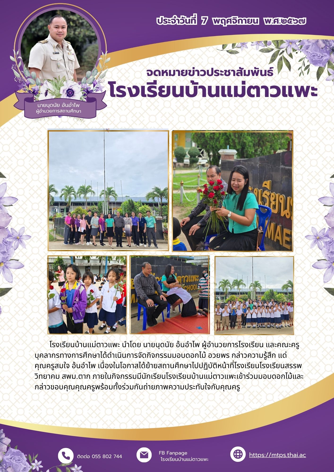 โรงเรียนบ้านแม่ตาวแพะ นำโดย นายนุดนัย อ้นอำไพ ผู้อำนวยการโรงเรียน และคณะครู บุคลากรทางการศึกษาได้ดำเนินการจัดกิจกรรมมอบดอกไม้ อวยพร กล่าวความรู้สึก แด่คุณครูสมใจ อ้นอำไพ เนื่องในโอกาสได้ย้ายสถานศึกษาไปปฏิบัติหน้าที่โรงเรียนโรงเรียนสรรพวิทยาคม สพม.ตาก ภายในกิจกรรมมีนักเรียนโรงเรียนบ้านแม่ตาวแพะเข้าร่วมมอบดอกไม้และกล่าวขอบคุณคุณครูพร้อมทั้งร่วมกันถ่ายภาพความประทับใจกับคุณครู