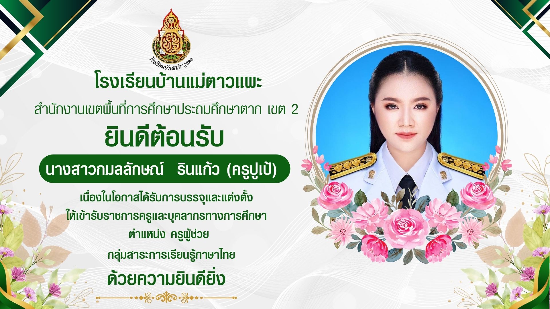 เนื่องในโอกาสได้รับบรรจุแต่งตั้งให้ดำรงตำแหน่ง ครูผู้ช่วย วิชาเอกภาษาไทย