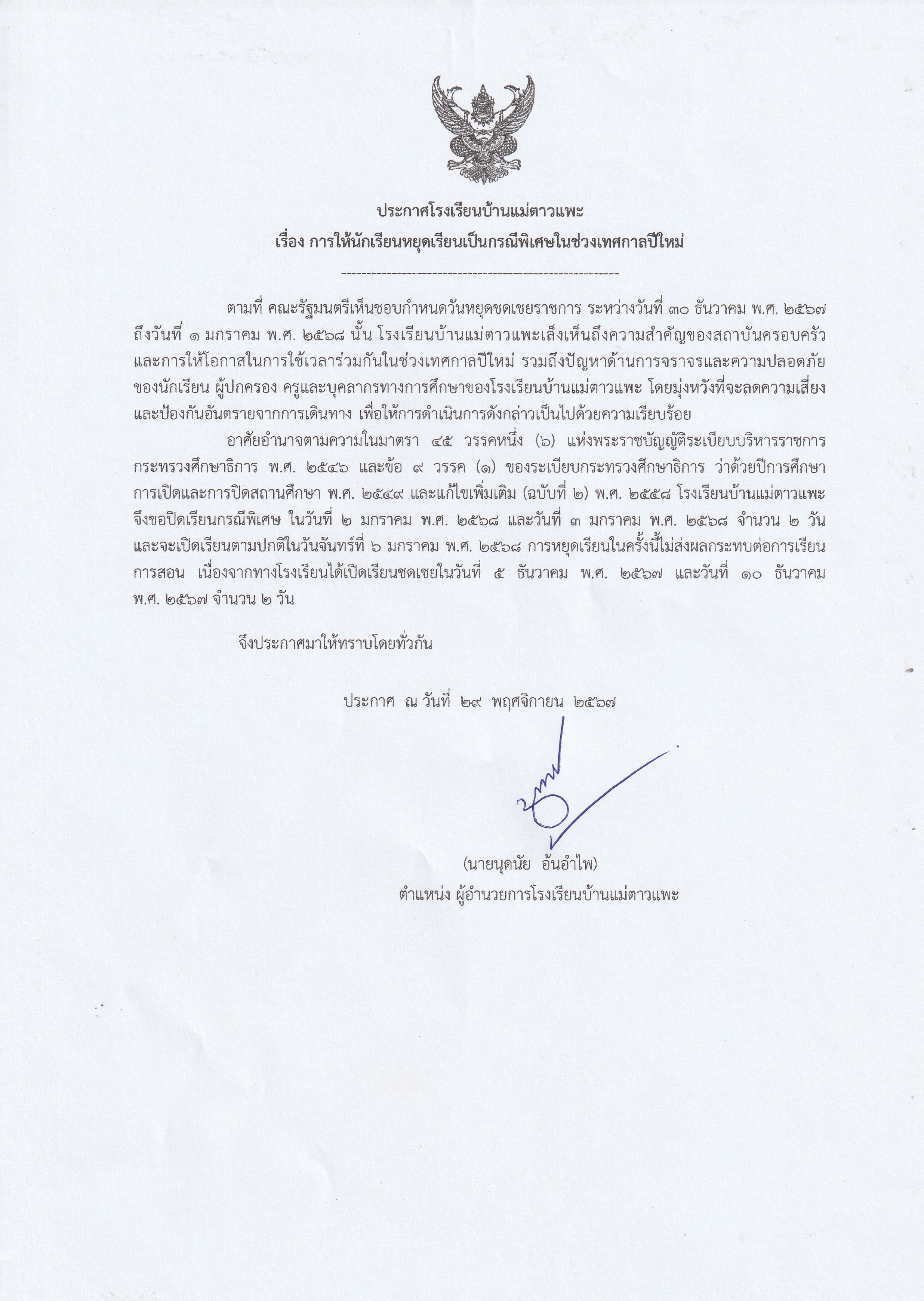 ประกาศ แจ้งการให้นักเรียนหยุดเรียนเป็นกรณีพิเศษในช่วงเทศกาลปีใหม่