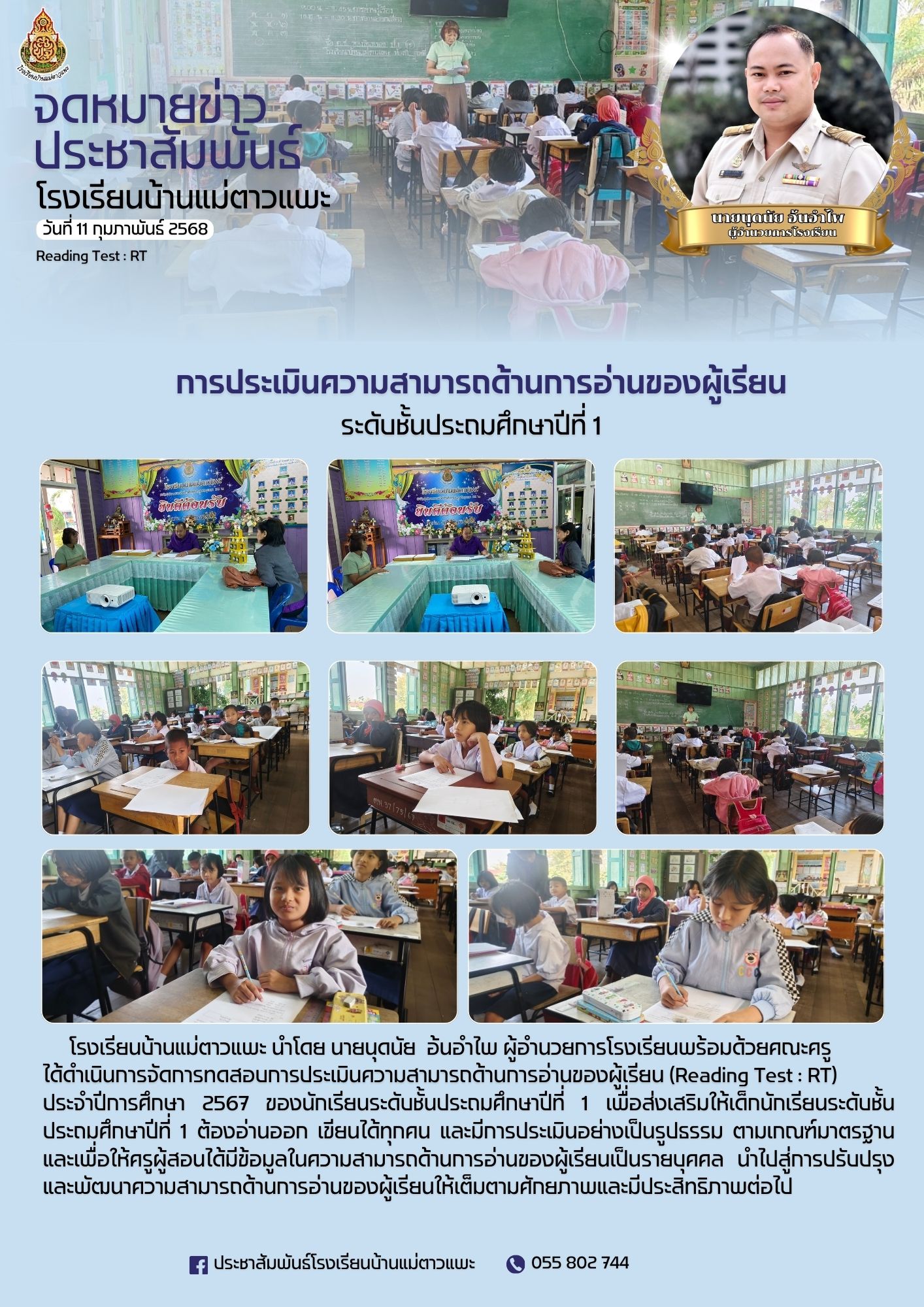 ประจำปีการศึกษา 2567 ของนักเรียนระดับชั้นประถมศึกษาปีที่ 1 เพื่อส่งเสริมให้เด็กนักเรียนระดับชั้นประถมศึกษาปีที่ 1 ต้องอ่านออก เขียนได้ทุกคน และมีการประเมินอย่างเป็นรูปธรรม ตามเกณฑ์มาตรฐาน และเพื่อให้ครูผู้สอนได้มีข้อมูลในความสามารถด้านการอ่านของผู้เรียนเป็นรายบุคคล นำไปสู่การปรับปรุงและพัฒนาความสามารถด้านการอ่านของผู้เรียนให้เต็มตามศักยภาพและมีประสิทธิภาพต่อไป