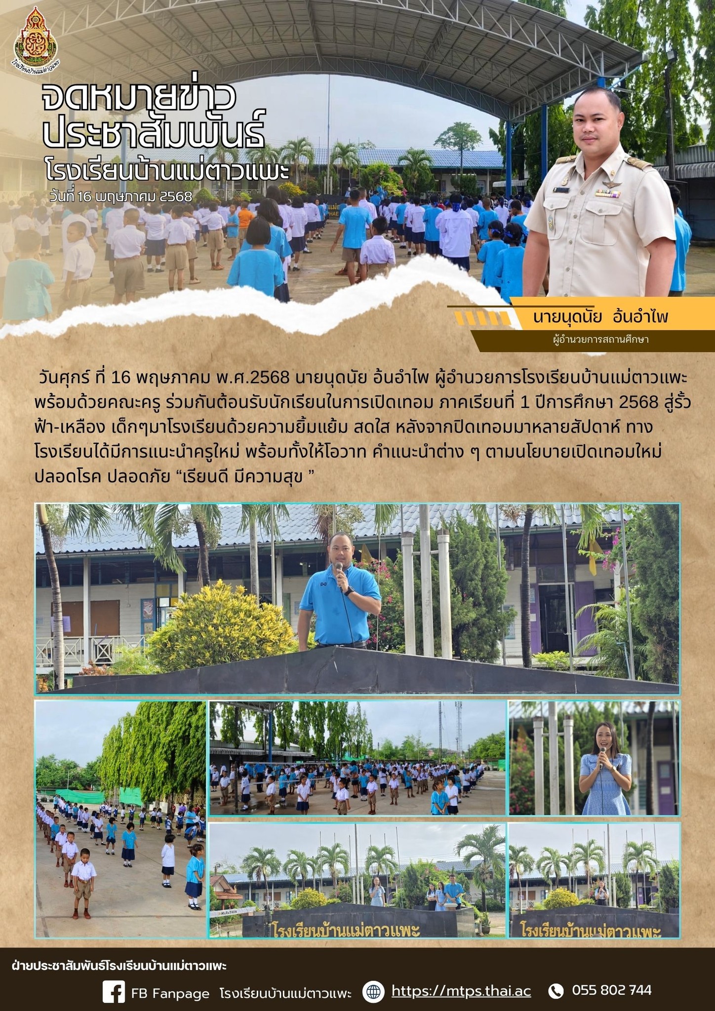 วันศุกร์ ที่ 16 พฤษภาคม พ.ศ.2568 นายนุดนัย อ้นอำไพ ผู้อำนวยการโรงเรียนบ้านแม่ตาวแพะพร้อมด้วยคณะครู ร่วมกันต้อนรับนักเรียนในการเปิดเทอม ภาคเรียนที่ 1 ปีการศึกษา 2568 สู่รั้วฟ้า-เหลือง เด็กๆมาโรงเรียนด้วยความยิ้มแย้ม สดใส หลังจากปิดเทอมมาหลายสัปดาห์ ทางโรงเรียนได้มีการแนะนำครูใหม่ พร้อมทั้งให้โอวาท คำแนะนำต่าง ๆ ตามนโยบายเปิดเทอมใหม่ ปลอดโรค ปลอดภัย “เรียนดี มีความสุข ”