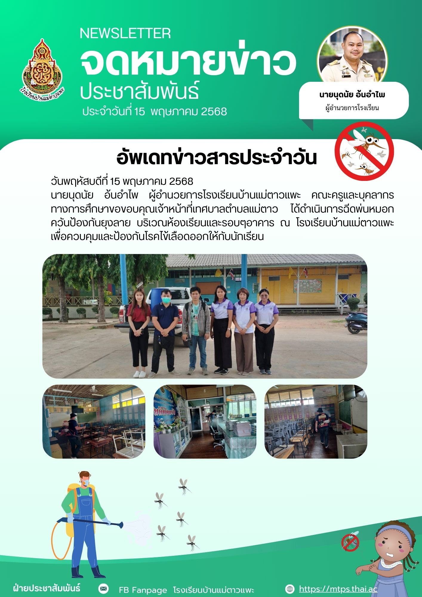 นายนุดนัย อ้นอำไพ ผู้อำนวยการโรงเรียนบ้านแม่ตาวแพะ คณะครูและบุคลากรทางการศึกษาขอขอบคุณเจ้าหน้าที่เทศบาลตำบลแม่ตาว ได้ดำเนินการฉีดพ่นหมอกควันป้องกันยุงลาย บริเวณห้องเรียนและรอบๆอาคาร ณ โรงเรียนบ้านแม่ตาวแพะ เพื่อควบคุมและป้องกันโรคไข้เลือดออกให้กับนักเรียน ขอขอบคุณค่ะ