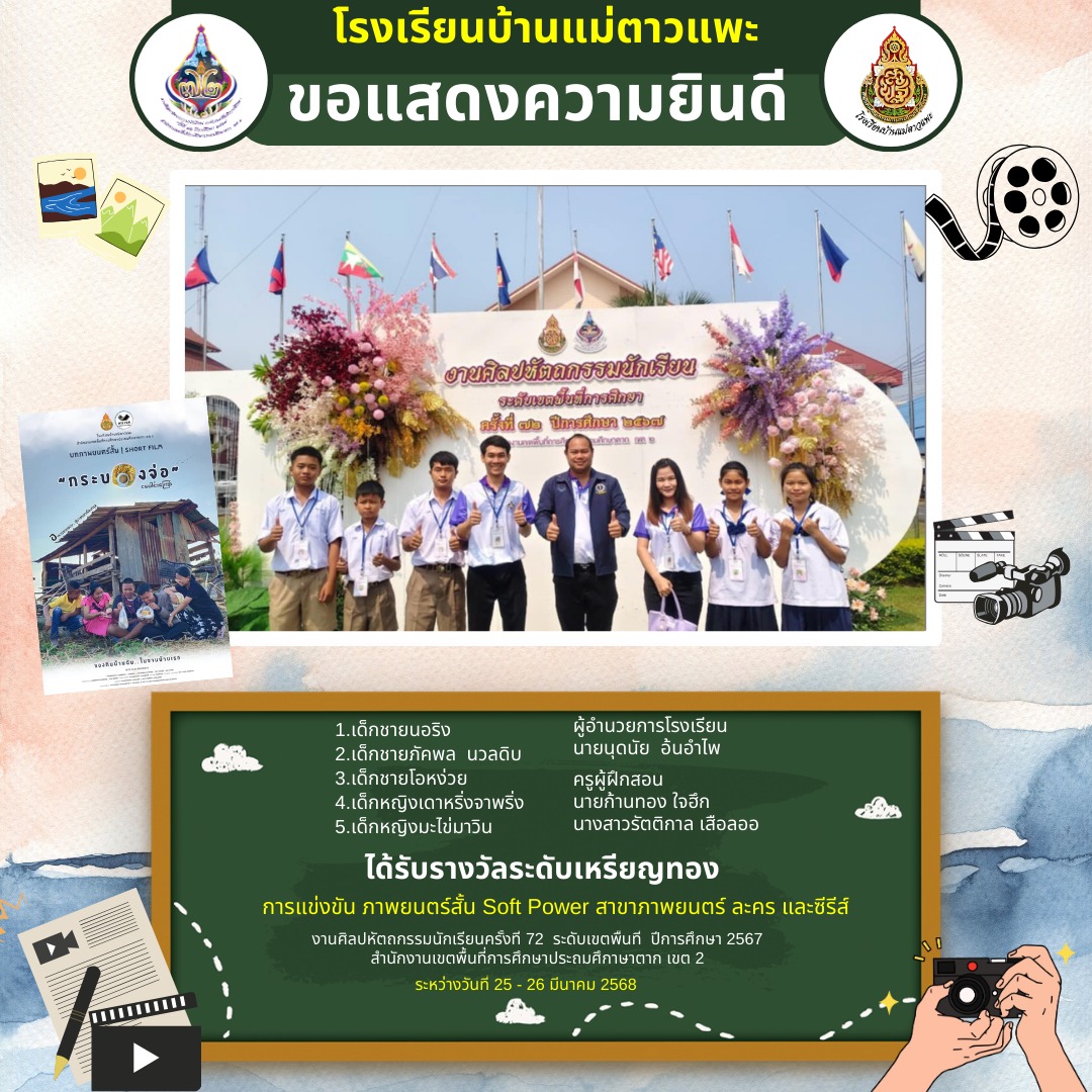 เมื่อวันที่ 25-26 เดือนมีนาคม พ.ศ.2568 นำโดยนายนุดนัย อ้นอำไพ ผู้อำนวยการโรงเรียน พร้อมด้วยคณะครูและตัวแทนนักเรียน โรงเรียนบ้านแม่ตาวแพะ เข้าร่วมการแข่งขันศิลปหัตถกรรมนักเรียน ครั้งที่ 72 ระดับเขต ประจำปีการศึกษา 2567 สำนักงานเขตพื้นที่การศึกษาประถมศึกษาตาก เขต 2