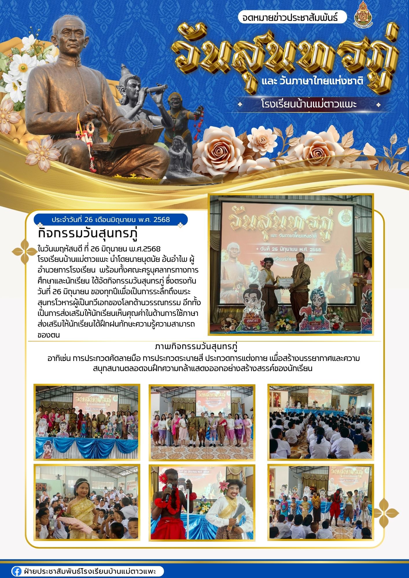 โรงเรียนบ้านแม่ตาวแพะ นำโดยนายนุดนัย อ้นอำไพ ผู้อำนวยการโรงเรียน พร้อมทั้งคณะครูบุคลากรทางการศึกษาและนักเรียน ได้จัดกิจกรรมวันสุนทรภู่ ซึ่งตรงกับวันที่ 26 มิถุนายน ของทุกปีเพื่อเป็นการระลึกถึงพระสุนทรโวหารผู้เป็นกวีเอกของโลกด้านวรรณกรรม อีกทั้งเป็นการส่งเสริมให้นักเรียนเห็นคุณค่าในด้านการใช้ภาษา ส่งเสริมให้นักเรียนได้ฝึกฝนทักษะความรู้ความสามารถของตน อาทิเช่น การประกวดคัดลายมือ การประกวดระบายสี ประกวดการแต่งกาย เพื่อสร้างบรรยากาศและความสนุกสนานตลอดจนฝึกความกล้าแสดงออกอย่างสร้างสรรค์ของนักเรียน