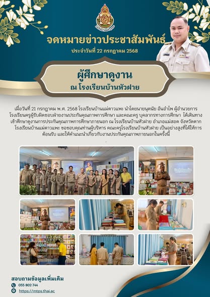 เมื่อวันที่ 21 กรกฎาคม พ.ศ. 2568 โรงเรียนบ้านแม่ตาวแพะ นำโดยนายนุดนัย อ้นอำไพ ผู้อำนวยการโรงเรียนครูผู้รับผิดชอบฝ่ายงานประกันคุณภาพการศึกษา และคณะครู บุคลากรทางการศึกษา ได้เดินทางเข้าศึกษาดูงานการประกันคุณภาพการศึกษาภายนอก ณ โรงเรียนบ้านหัวฝาย อำเภอแม่สอด จังหวัดตาก