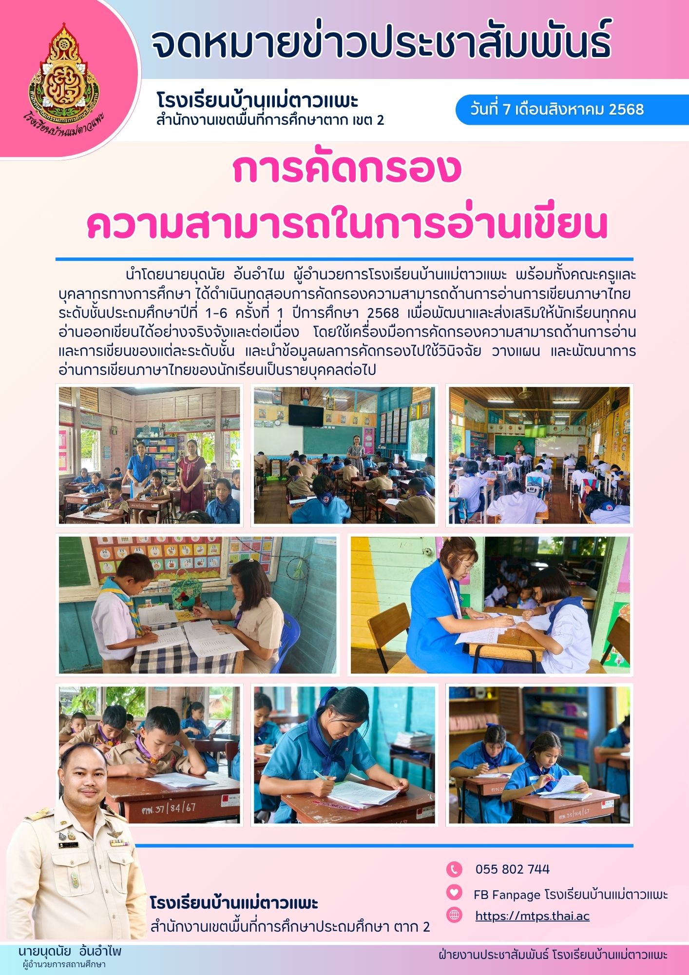 นำโดยนายนุดนัย อ้นอำไพ ผู้อำนวยการโรงเรียนบ้านแม่ตาวแพะ พร้อมทั้งคณะครูและบุคลากรทางการศึกษา ได้ดำเนินทดสอบการคัดกรองความสามารถด้านการอ่านการเขียนภาษาไทย