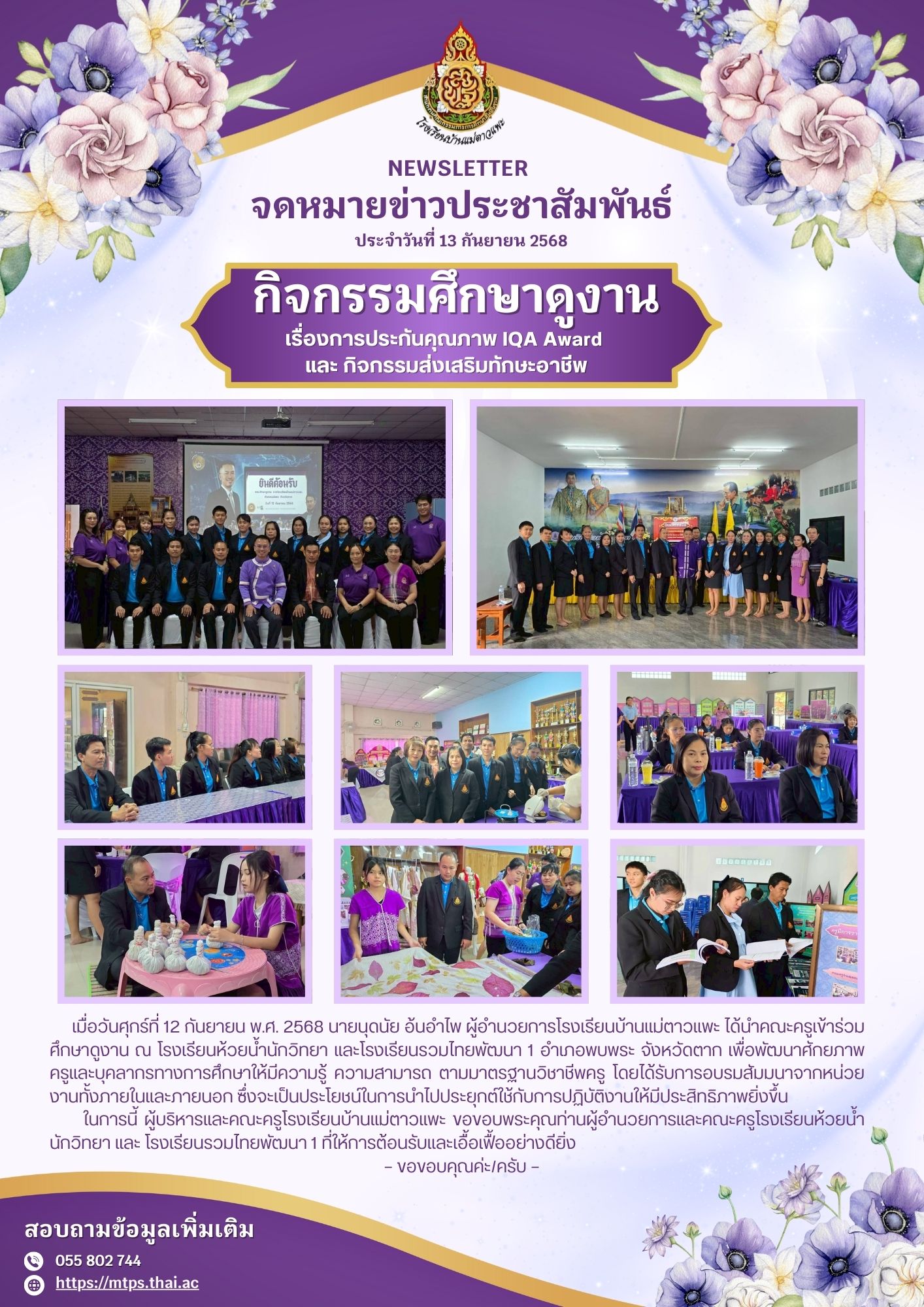เมื่อวันศุกร์ที่ 12 กันยายน พ.ศ. 2568 นายนุดนัย อ้นอำไพ ผู้อำนวยการโรงเรียนบ้านแม่ตาวแพะ ได้นำคณะครูเข้าร่วมศึกษาดูงาน ณ โรงเรียนห้วยน้ำนักวิทยา และโรงเรียนรวมไทยพัฒนา 1 อำเภอพบพระ จังหวัดตาก เพื่อพัฒนาศักยภาพครูและบุคลากรทางการศึกษาให้มีความรู้ ความสามารถ ตามมาตรฐานวิชาชีพครู โดยได้รับการอบรมสัมมนาจากหน่วยงานทั้งภายในและภายนอก ซึ่งจะเป็นประโยชน์ในการนำไปประยุกต์ใช้กับการปฏิบัติงานให้มีประสิทธิภาพยิ่งขึ้น
