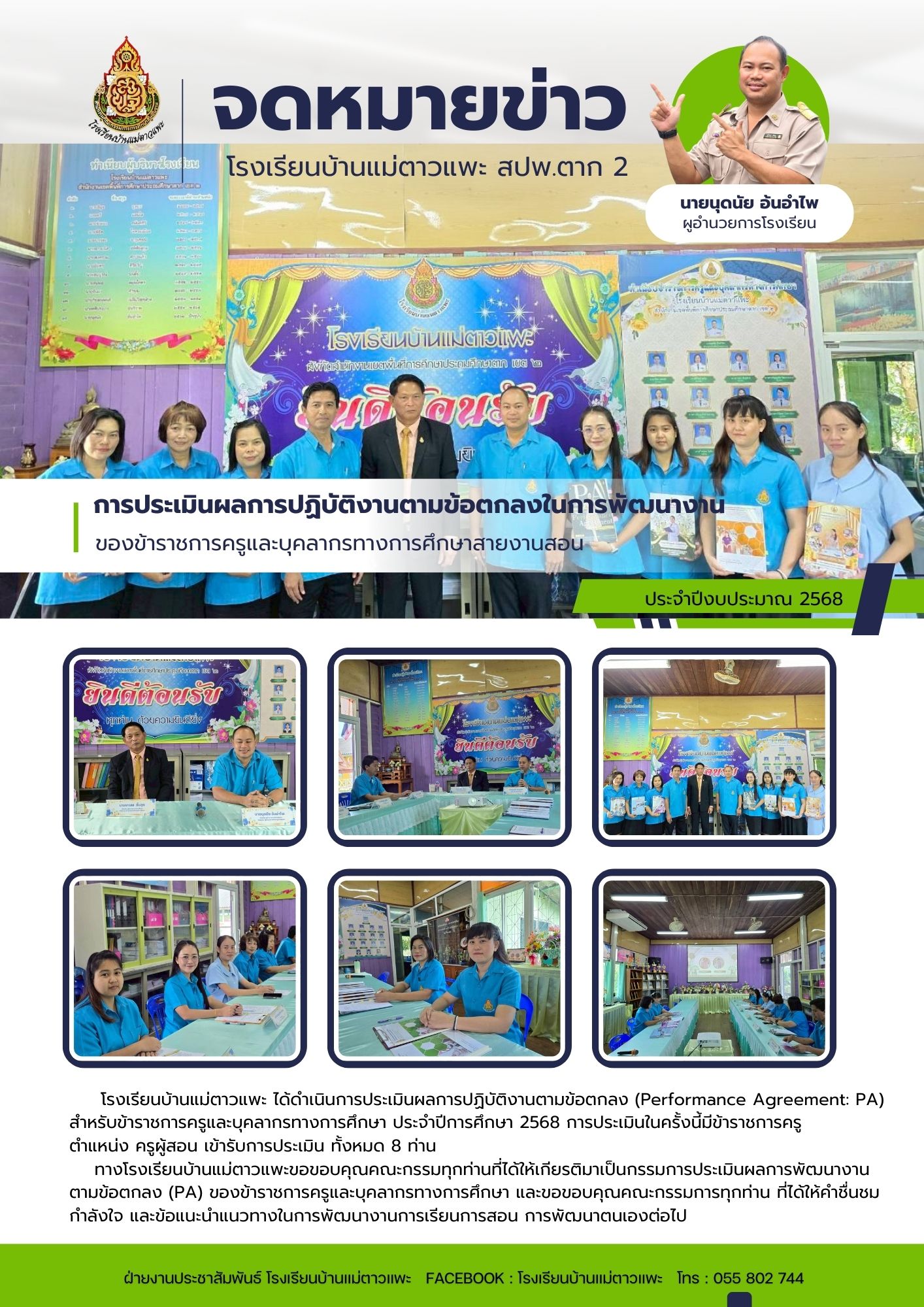 โรงเรียนบ้านแม่ตาวแพะ ได้ดำเนินการประเมินผลการปฏิบัติงานตามข้อตกลง (Performance Agreement: PA) สำหรับข้าราชการครูและบุคลากรทางการศึกษา ประจำปีการศึกษา 2568 การประเมินในครั้งนี้มีข้าราชการครู
