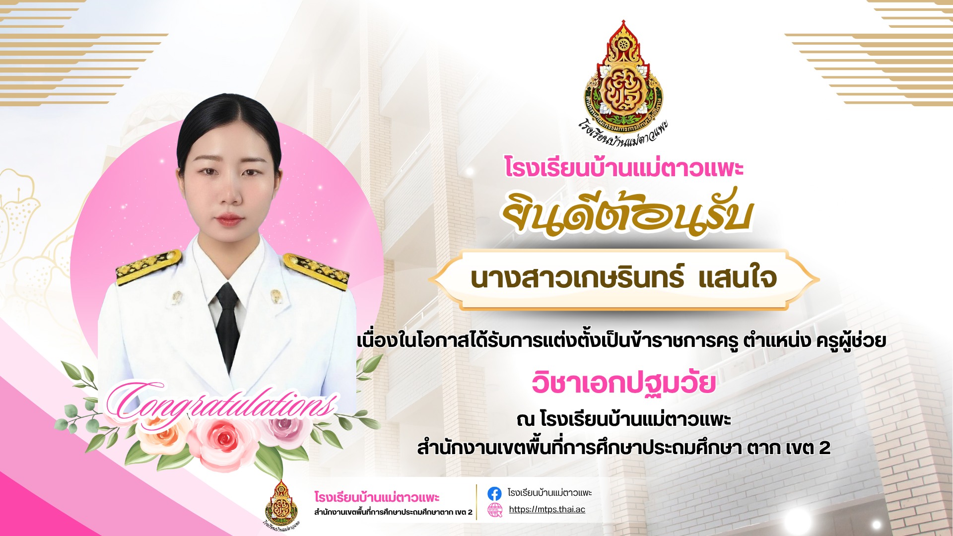เนื่องในโอกาสได้รับบรรจุแต่งตั้งให้ดำรงตำแหน่ง ครูผู้ช่วย วิชาเอกปฐมวัย
