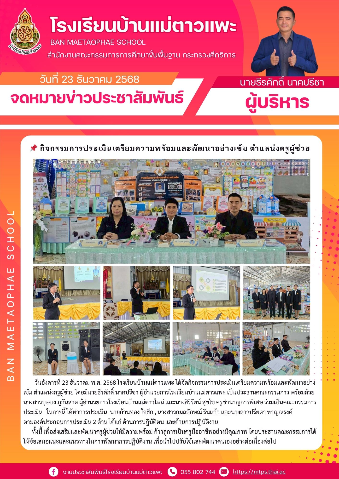 วันอังคารที่ 23 ธันวาคม พ.ศ. 2568 โรงเรียนบ้านแม่ตาวแพะ ได้จัดกิจกรรมการประเมินเตรียมความพร้อมและพัฒนาอย่างเข้ม ตำแหน่งครูผู้ช่วย โดยมีนายธีรศักดิ์ นาคปรีชา ผู้อำนวยการโรงเรียนบ้านแม่ตาวแพะ เป็นประธานคณะกรรมการ พร้อมด้วยนางสาวบุษบง ภูกันสาด ผู้อำนวยการโรงเรียนบ้านแม่ตาวใหม่ และนางสิริรัตน์ สุขโข ครูชำนาญการพิเศษ ร่วมเป็นคณะกรรมการประเมิน ในการนี้ ได้ทำการประเมิน นายก้านทอง ใจฮึก , นางสาวกมลลักษณ์ รินแก้ว และนางสาวปรียดา หาญณรงค์ ตามองค์ประกอบการประเมิน 2 ด้าน ได้แก่ ด้านการปฏิบัติตน และด้านการปฏิบัติงาน